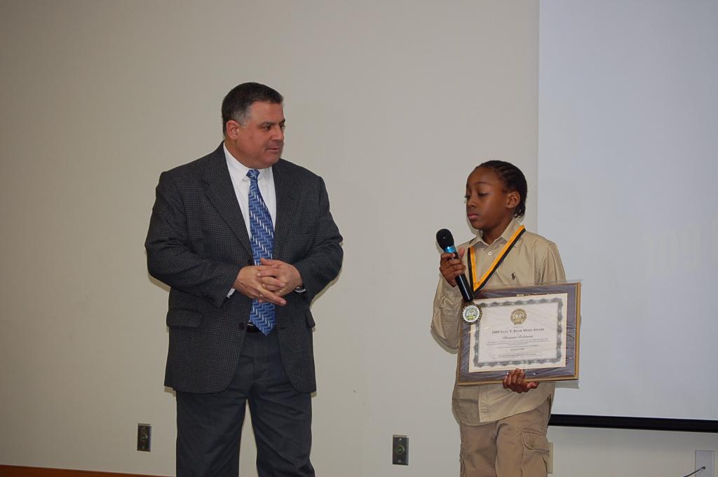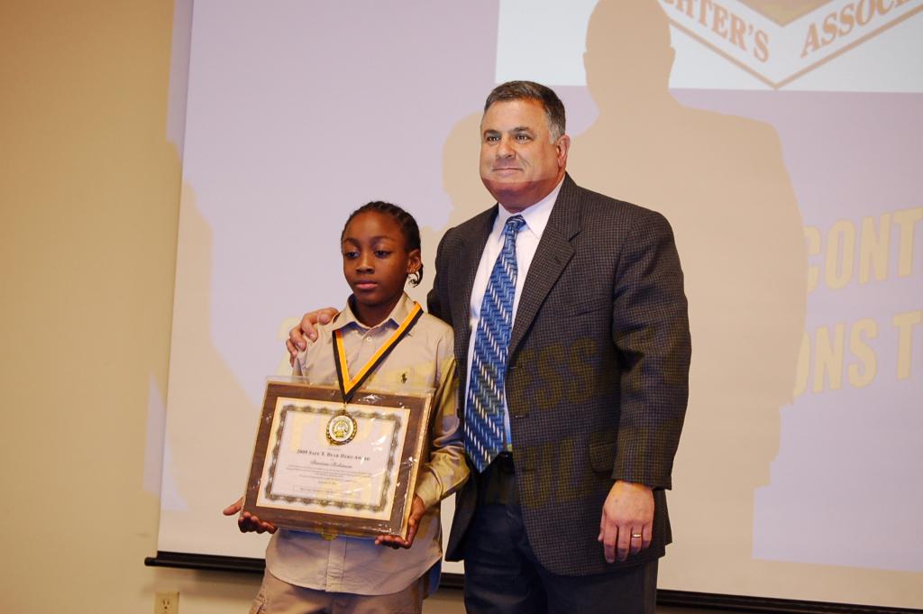 At the DVFA Fire Prevention Awards held on Sunday January 17, 2010 at the Cheswold Fire Station the Delaware Children's Fire Safety Foundation presented Mr. Daveyon Robinson with a live saving award. Daveyon was sitting in the lunch room at the Dover South Elementary School with friends eating lunch. One of his table mates begain to choke on a piece of chicken. The table mate had been to a trainng class on first aid and put his hands acrossed his throat the universal sign of choking. While others thought it was a prank Daveyon ask the table mate if he could speak the table mate shock his head no. Daveyon admisistered two thrust to dislodge the food and the table mate started to breath again. Ms Rochelle Mason and family Crisis therapist at the school taught a class on the Hiemlich manoeuver just weeks prior to the incident.
