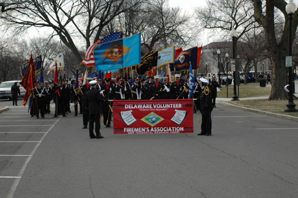 On January 20, 2009 the Officers and Members of the Delaware Volunteer Firemen's Association including the Citizens' Hose Company Band, had the privilege to participate in the 2009 Presidential Inaugural parade honoring President Barack Obama and Vice President Joe Biden ( a DVFA Past President Emeritus). 400 members from Delaware fire companies and Ladies Auxiliaries braved the extreme cold and wind to participate in the once in this once in a lifetime event. President Warren Jones led our memebers who proudly showed thier colors, parading in their dress uniforms and displaying company flags along the nearly 4-mile route through the Nation’s Capital. Photos chronical the historic day from initial security clearence to the Presidential reviewing stand.